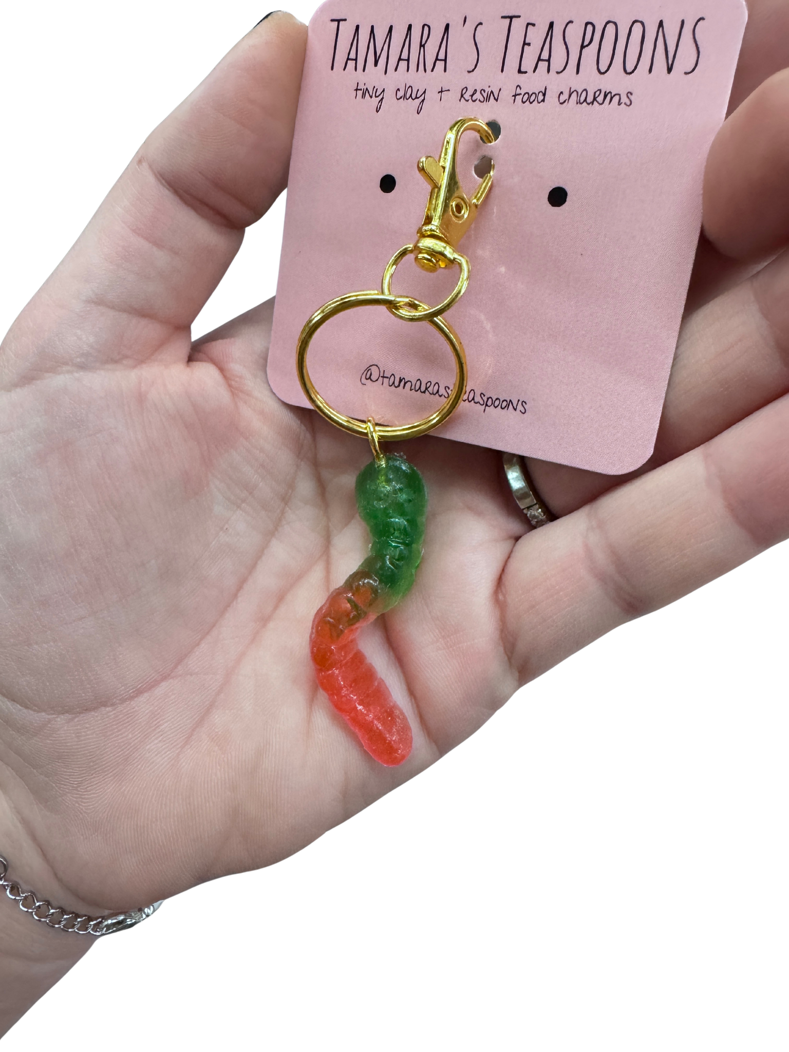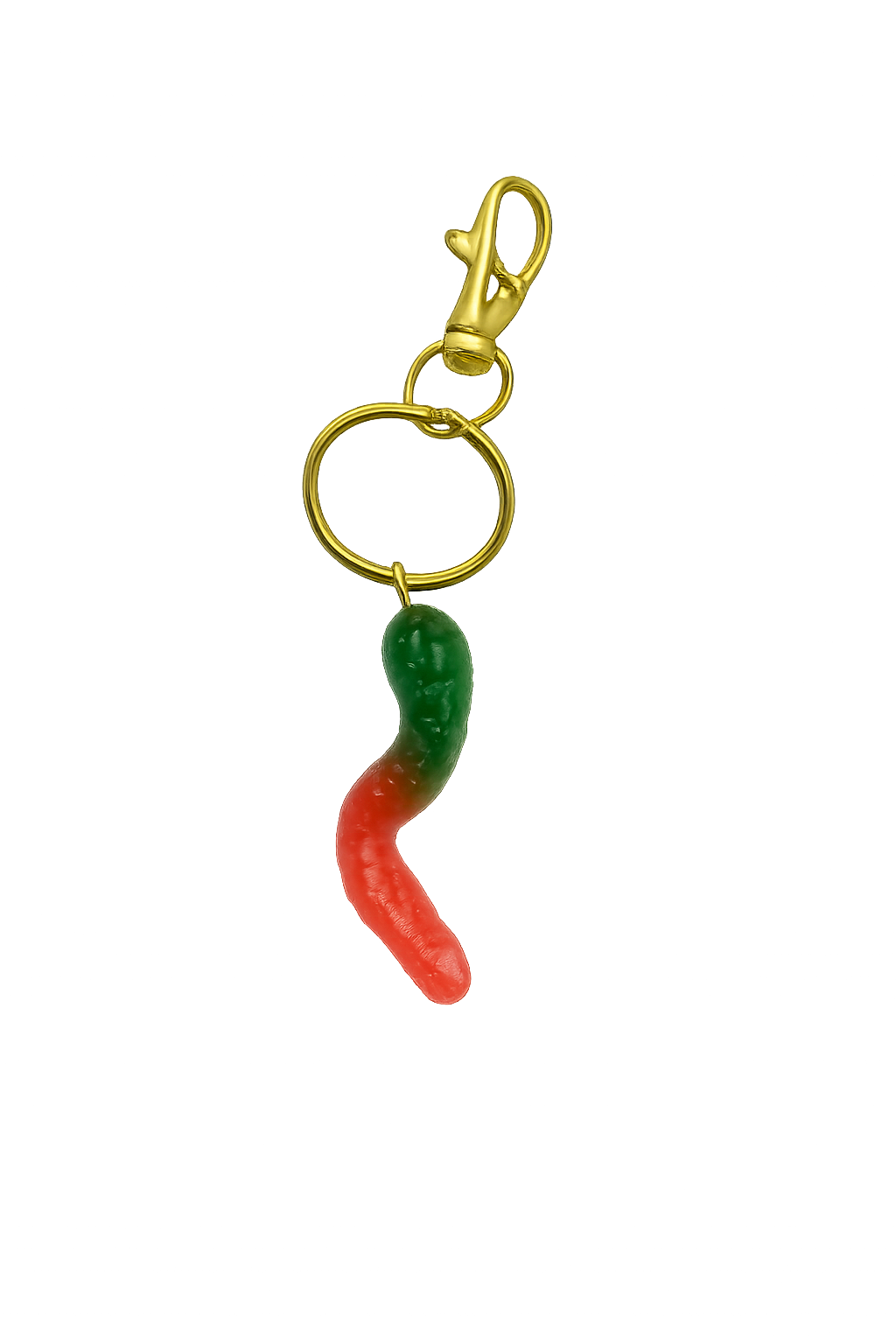 This green & red gummy worm bag charm is handmade from resin using a custom mold I designed and made myself. Inspired by classic candy favorites, it has a glossy, candy-like finish that makes it look good enough to eat (but please don’t 😉).